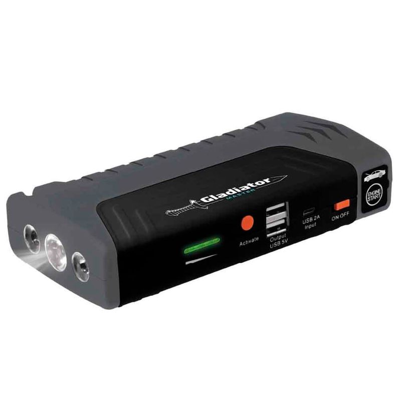 Arrancador multifunción GLADIATOR 600A, potente y versátil. Ideal para iniciar vehículos, con funciones de carga de batería y linterna LED. Compacto, fácil de usar y esencial para emergencias.