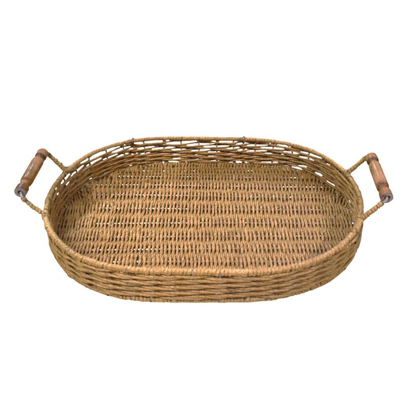 La bandeja oval de rafia con asa en madera de acacia es un artículo doméstico versátil y elegante. Confeccionada en rafia de alta calidad, cuenta con asas robustas de madera de acacia, proporcionando un agarre cómodo y seguro. Perfecta para servir alimentos o como elemento decorativo.