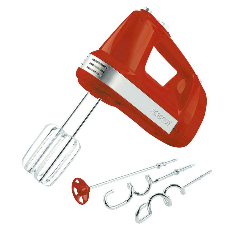 Prepara tus mejores recetas fácil y rápido. Batidora de mano PEABODY modelo PE-HM300R. Cuenta con 300W de potencia, 5 niveles de velocidad + Función TURBO. Incluye accesorio batidor, amasador y espumador. Garantia 2 años.