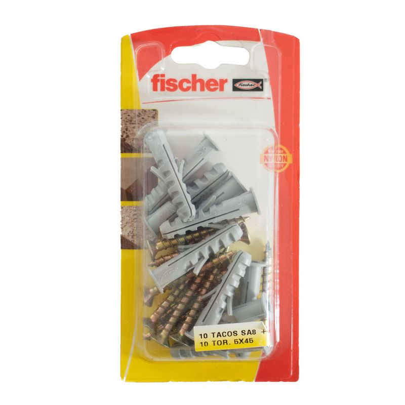El blister con 10 tacos Fischer de nylon SA8 y tornillos TMF 5 x 45 es la elección perfecta para fijaciones sólidas en concreto y mampostería. Durabilidad y seguridad garantizadas.