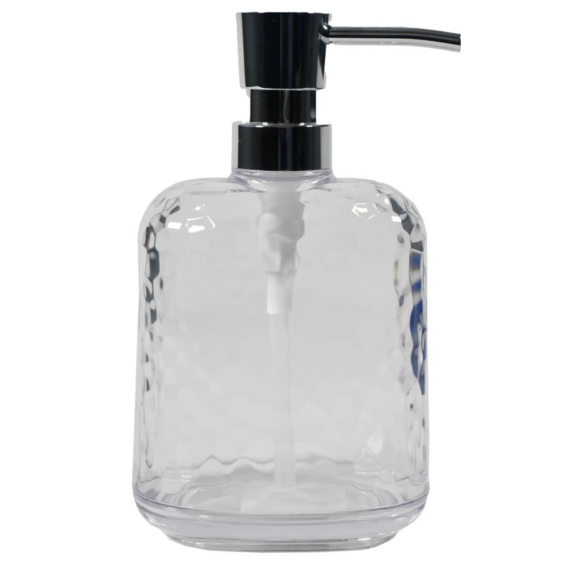 Este dispensador de jabón está hecho de plástico brillante y transparente, ideal para combinar con cualquier tipo de decoración
