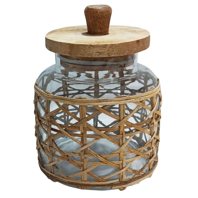Frasco Vidrio con Tapa Madera Forrado Hilo 15x12 cm