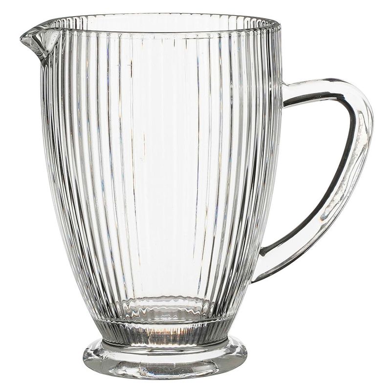 Esta elegante jarra de vidrio transparente, de 18.5 x 14 cm, combina diseño y funcionalidad. Perfecta para servir bebidas frías, su estructura robusta y estilizada añade un toque de distinción a cualquier mesa.