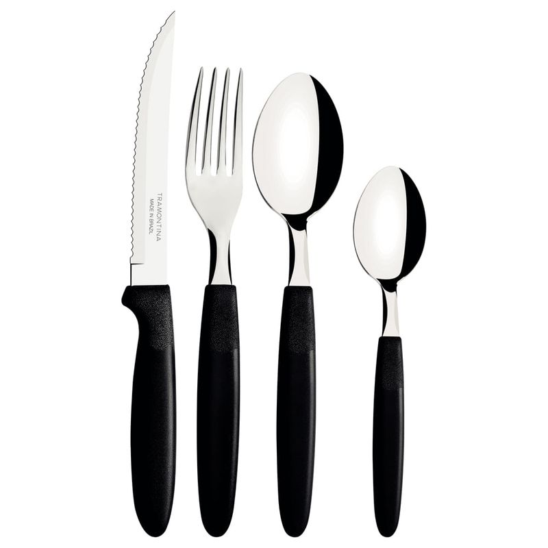 ¿Quieres una solución práctica para tener la cubertería adecuada para las comidas más variadas? Entonces descubra el juego de cubiertos Tramontina Ipanema con hojas de acero inoxidable y mangos de polipropileno negro en bote de plástico, 24 piezas. Una cubertería con tenedores, cuchillos y cucharas para servir desde el entrante hasta el postre, que cuenta con piezas producidas con hojas de acero inoxidable con espesores y formas diferenciadas que garantizan una mayor durabilidad y resistencia. Los mangos están fabricados en polipropileno y garantizan una mayor comodidad en el manejo, además de hacer su mesa mucho más moderna, debido al color negro. Incluso lo acompaña un bote de plástico, perfecto para guardar tus piezas o alimentos como pasta u otros cereales. ¡Sin duda la opción ideal para tu cocina!