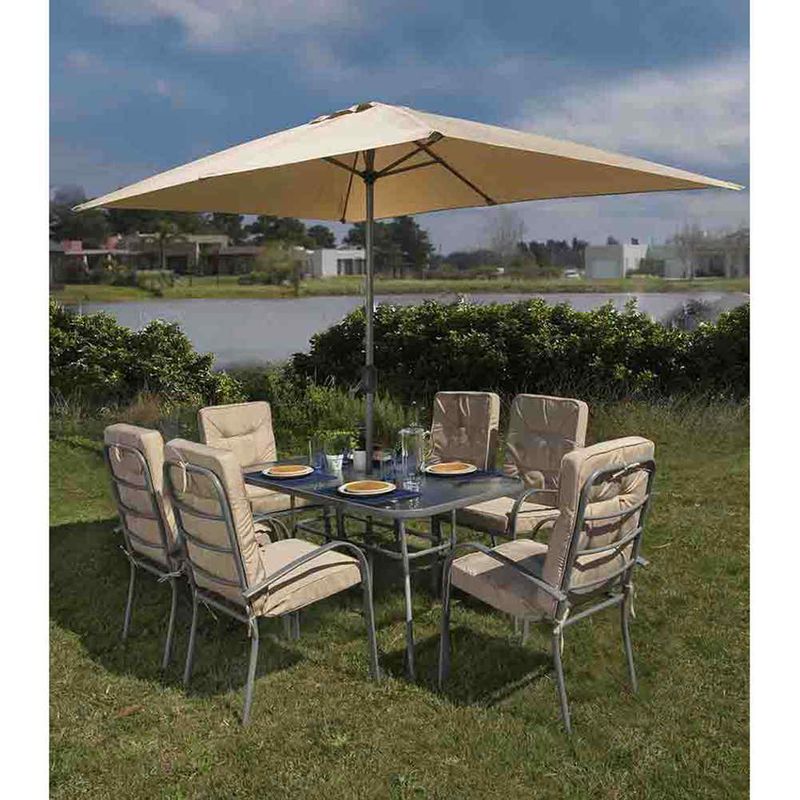 Juego de jardín 6 sillas + mesa + sombrilla. Este artículo se vende en caja, el armado no está incluido, usted puede contactar a un armador externo llamando a nuestro servicio de Atención al Cliente. El artículo ofrecido es el que corresponde a la descripción, cualquier accesorio es meramente ilustrativo.