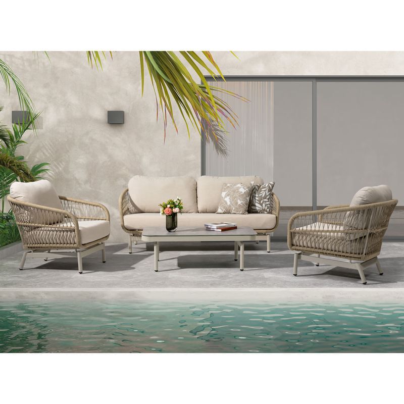 El Juego de Jardín APOLO en aluminio consta de 4 piezas: una mesa, dos sillas y un sofá. Está diseñado para ofrecer comodidad y durabilidad gracias a su marco de aluminio resistente. Su diseño elegante es simple, pero atractivo, perfecto para cualquier espacio al aire libre.