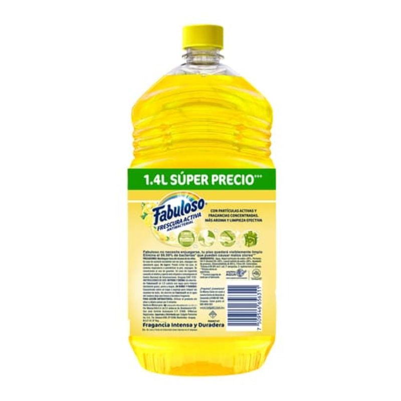 Fabuloso Frescura Activa Antibacterial Limón refrescante es un limpiador multiusos, con fragancia fresca, intensa y duradera limpiando fácilmente todo el hogar. Se puede utilizar en toda la casa quitando la grasa, el polvo y la mugre de pisos y superficies sin necesidad de enjuagarse dejándolos visiblemente más limpios. Fabuloso Limón refrescante contiene una fórmula antibacterial la cual elimina el 99.99% de las bacterias que pueden causar malos olores como E. Coli, P. Aeruginosa, S. Tiphymirium y S. Aureus, dando como resultado una poderosa y efectiva limpieza con un duradero y agradable aroma haciendo la estancia en el hogar aún más placentera.