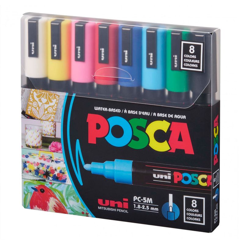 El set de marcadores Uni POSCA de 2,5 mm ofrece 8 colores intensos. Son versátiles, ideales para pintar, escribir y decorar sobre múltiples superficies con trazos firmes y cobertura opaca de alta calidad.
