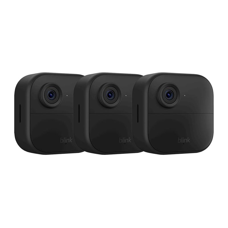 Pack x 3 Cámaras Wi Fi BLINK Exterior a Batería. Pack de 3 cámaras de seguridad exterior a batería con conexión WIFI y resolución 1080p. Ofrecen vigilancia continua con video HD nítido y detección de movimiento. Su diseño inalámbrico facilita la instalación en cualquier lugar, proporcionando seguridad y control