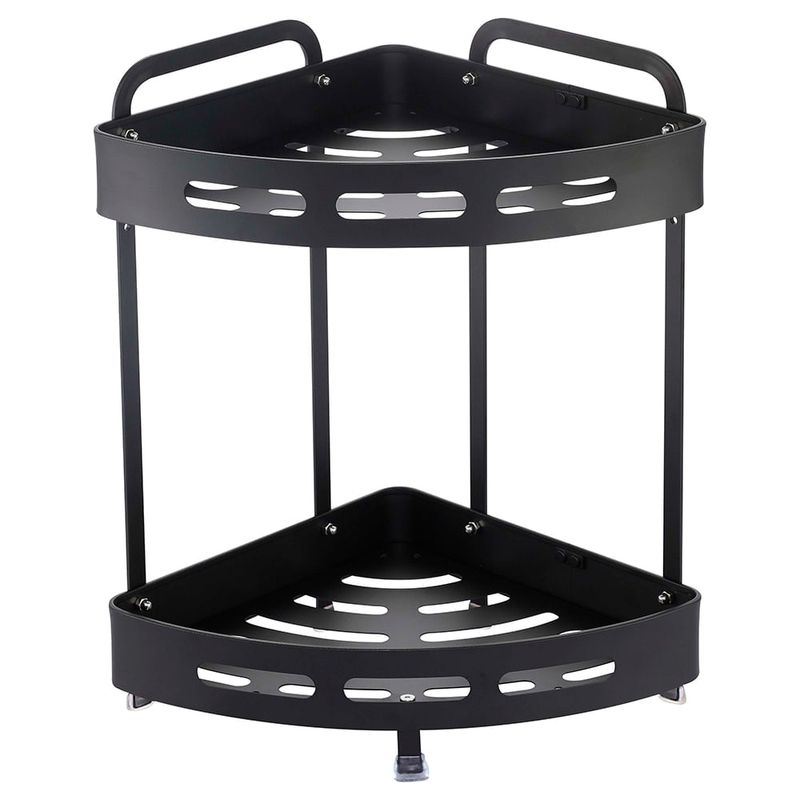 Rack esquinero para baño de 2 pisos en aluminio negro, ideal para maximizar el espacio y organizar productos de higiene. Su diseño elegante y moderno complementa cualquier decoración, proporcionando funcionalidad y estilo.