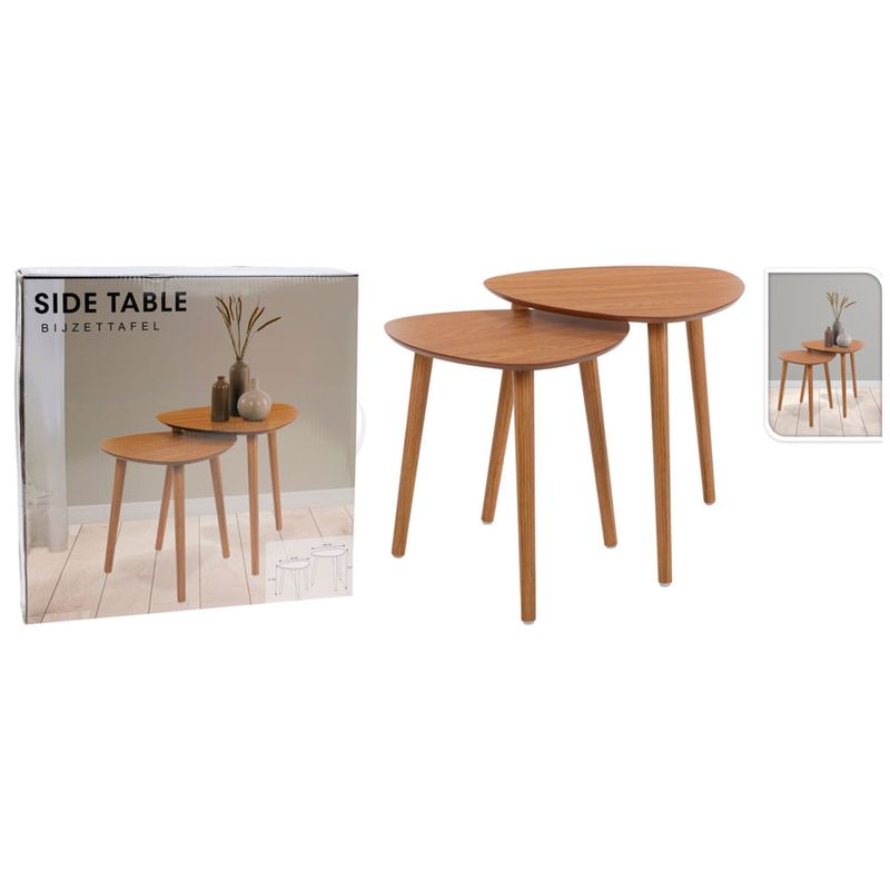 Este set incluye dos mesas auxiliares de madera en color natural. Ambas poseen un diseño sencillo pero elegante, ideales para complementar cualquier decoración. Son versátiles, robustas y proporcionan una superficie útil para colocar objetos cotidianos.